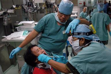 | Keywords: US Navy 060615-N-2832L-052 edical Treatment Facility aboard the U.S. Military Sealift Command (MSC) Hospital Ship USNS Mercy (T-AH 19).jpg en Tawi Tawi Philippines June 15 2006 - Capt Warlito Chee a Philippine Marine doctor and Manila native with the Medical Treatment Facility aboard the U S Military Sealift Command MSC Hospital Ship USNS Mercy T-AH 19 works with Dr Enriquez a volunteer from the city to remove a tooth from a patient during a Medical Civil Action Project MEDCAP while the ship visits the city on a scheduled humanitarian mission The medical crew aboard Mercy will provide general and ophthalmology surgery basic medical evaluation and treatment preventive medicine treatment dental screenings and treatment optometry screenings eyewear distribution public health training and veterinary services as requested by the host nations Mercy is uniquely capable of supporting medical and humanitarian assistance needs and is configured with special medical equipment and a robust multi-specialized medical team who can provide a range of services ashore as well as aboard the ship The medical staff is augmented with an assistance crew many of whom are part of non-governmental organizations which have significant medical capabilities Mercy is on a five-month deployment to South Asia Southeast Asia and the Pacific Islands U S Navy photo by Journalist Seaman Apprentice Mike Leporati RELEASED 2006-06-15 060615-N-2832L-052 Navy http //www navy mil/view_image asp id 35846 U S Navy photo by Journalist Seaman Apprentice Mike Leporati PD-USGov-Military-Navy Images from US Navy location Tawi-Tawi Philippines Aboard USNS Mercy T-AH-19 |
