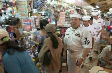 | Keywords: US Navy 060702-N-9851B-005 Sailors assigned to the rescue and salvage ship USS Salvor (ARS 52), walk through the Binh Tay Market.jpg en Ho Chi Minh City Vietnam July 2 2006 - Interior Communications Electronics Technician 1st Class Dallas Miller Ship's Serviceman 1st Class Tito Acruz Electrician's Mate 1st Class Judelito Lobederio and Electrician's Mate 2nd Class Jovibs Canoy assigned to the rescue and salvage ship USS Salvor ARS 52 walk through the Binh Tay Market in the China Town of Ho Chi Minh City Vietnam Sailors from Salvor and the mine countermeasures ship USS Patriot MCM 7 will have an opportunity to interact with the Vietnamese people through a variety of events including a community service project at a local orphanage and a volleyball game with the Navy division of the People's Army of Vietnam PAVN U S Navy photo by Mass Communication Specialist 2nd Class John L Beeman RELEASED 2006-07-02 060702-N-9851B-005 Navy http //www navy mil/view_image asp id 36421 U S Navy photo by Mass Communication Specialist 2nd Class John L Beeman PD-USGov-Military-Navy Images from US Navy location Ho Chi Minh City Vietnam People of Ho Chi Minh City USS Patriot MCM-7 Interior Communications Electrician Binh Tay Market |