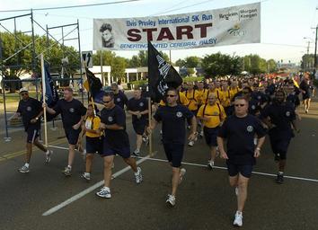 | Keywords: US Navy 060812-N-5862D-269 Naval Support Activity Mid-South Chief Petty Officer's Association members and the 2006 CPO selectees start the 24th Annual Elvis Presley International 5k Run to benefit United Cerebral Palsy (UCP) at.jpg en Memphis Tenn Aug 12 2006 - Naval Support Activity Mid-South Chief Petty Officer's Association members and the 2006 CPO selectees start the 24th Annual Elvis Presley International 5k Run to benefit United Cerebral Palsy UCP at the gates of Graceland in Memphis The 147 Sailors ran in formation finishing at 39 10 and were awarded a plaque from the UCP Foundation for the largest participating group U S Navy photo by Chief Mass Communication Specialist Chris Desmond RELEASED 2006-08-12 060812-N-5862D-269 Navy http //www navy mil/view_image asp id 38002 U S Navy photo by Chief Mass Communication Specialist Chris Desmond PD-USGov-Military-Navy Images from US Navy location Memphis Tenn |
