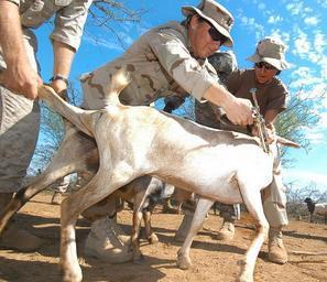 | Keywords: US Navy 060815-N-0411D-018 U.S. Army Veterinarian, Capt Gwynne Kinley of Cape Elizabeth, Maine, immunizes a goat with the help of U.S. Navy Operations Specialist 2nd Class Jessica Silva.jpg en Chemeril Kenya Aug 15 2006 - U S Army Veterinarian Capt Gwynne Kinley of Cape Elizabeth Maine immunizes a goat with the help of U S Navy Operations Specialist 2nd Class Jessica Silva right of Houston Texas and U S Marine Lance Cpl Darrrell Brandes of Goliad Texas During exercise Natural Fire over 2000 sheep and goats were vaccinated against Sheep Pox and Pleural Pneumonia at a Veterinary Civil Assistance Project VETCAP operated by U S Kenyan Tanzanian and Ugandan veterinarians and doctors Natural Fire is the largest combined exercise between Eastern African community nations and the United States and includes medical veterinary and engineering civic affairs programs U S Navy photo by Mass Communication Specialist 2nd Class Roger S Duncan RELEASED 2006-08-15 060815-N-0411D-018 Navy http //www navy mil/view_image asp id 38793 U S Navy photo by Mass Communication Specialist 2nd Class Roger S Duncan PD-USGov-Military-Navy Images from US Navy location Chemeril Kenya Goats Veterinarians from the United States Veterinary vaccinations Women in the United States Navy Women in the United States Army 2006 in Kenya |