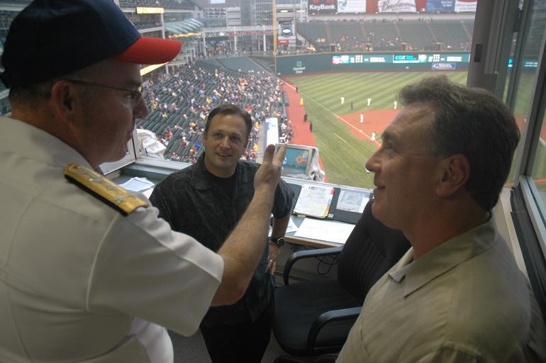 Keywords: US Navy 060828-N-1805P-007 Chief of Naval Personnel Vice Adm. John C. Harvey Jr. chats with broadcasters from Cleveland radio station WTAM 1100 AM during a Major League Baseball game at Jacobs Field between the Cleveland Indian.jpg en Cleveland Ohio Aug 28 2006 - Chief of Naval Personnel Vice Adm John C Harvey Jr chats with broadcasters Tom Hamilton and Matt Underwood from the Cleveland Indians Radio Network during a Major League Baseball game at Jacobs Field between the Cleveland Indians and Toronto Blue Jays Harvey administered the oath reenlisting to 15 Sailors assigned to Navy Operational Support Center Cleveland on the field before the game He also threw out the ceremonial first pitch Vice Adm Harvey was participating in events kicking off Cleveland Navy Week 2006 which runs Aug 28-Sep 4 Twenty-six such weeks are planned this year in cities throughout the U S arranged by the Navy Office of Community Outreach NAVCO The mission of NAVCO is to enhance the Navy's brand image in areas with limited exposure to the Navy U S Navy photo by Mass Communication Specialist 1st Class Jason J Perry RELEASED 2006-08-28 060828-N-1805P-007 Navy http //www navy mil/view_image asp id 38590 U S Navy photo by Mass Communication Specialist 1st Class Jason J Perry PD-USGov-Military-Navy Progressive Field Radio personalities from the United States Images from US Navy location Cleveland Ohio John C Harvey Jr WTAM Cleveland Navy Week |