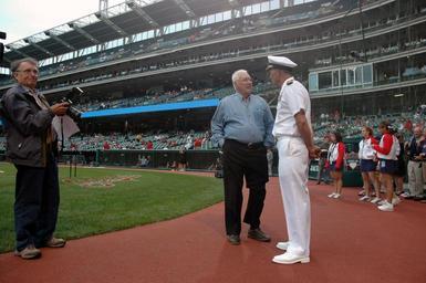 | Keywords: US Navy 060830-N-1805P-003 Amphibious transport dock ship USS Cleveland (LPD 7) Commanding Officer, Capt. Frank McCulloch and Major League Baseball Hall of Fame Inductee and World War II Navy veteran Bob Feller swap sea stories.jpg en Cleveland Ohio Aug 30 2006 - Amphibious transport dock ship USS Cleveland LPD 7 Commanding Officer Capt Frank McCulloch and Major League Baseball Hall of Fame Inductee and World War II Navy veteran Bob Feller swap sea stories at Jacobs Field before the start of the Major League Baseball game between the Indians vs Toronto Blue Jays Cleveland Sailors are in their ship's namesake town for Cleveland Navy Week festivities Twenty-six such Navy Weeks are planned this year in cities throughout the U S arranged by the Navy Office of Community Outreach NAVCO The mission of NAVCO is to enhance the Navy's brand image in areas with limited exposure to the Navy U S Navy photo by Mass Communication Specialist 1st Class Jason J Perry RELEASED 2006-08-30 060830-N-1805P-003 Navy http //www navy mil/view_image asp id 38685 U S Navy photo by Mass Communication Specialist 1st Class Jason J Perry PD-USGov-Military-Navy USS Cleveland LPD-7 Bob Feller Progressive Field Images from US Navy location Cleveland Ohio Cleveland Navy Week |