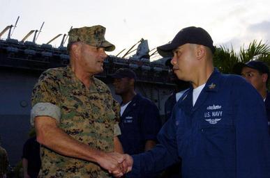 | Keywords: US Navy 061018-N-5067K-084 Commanding General III Marine Expeditionary Force, Commander Marine Forces Japan, Lt. Gen. Joseph F. Weber shakes the hand of Storekeeper 1st Class Hernando Rasay.jpg en Subic Bay Philippines Oct 18 2006 - Commanding General III Marine Expeditionary Force Commander Marine Forces Japan Lt Gen Joseph F Weber shakes the hand of Storekeeper 1st Class Hernando Rasay assigned to USS Essex LHD 2 Essex is currently participating in workups with embarked 31st Marine Expeditionary Unit MEU in preparation for their fall patrol that includes exercises with the Republic of the Philippines U S Navy photo by Mass Communication 1st Class Michael D Kennedy RELEASED 2006-10-18 061018-N-5067K-084 Navy http //www navy mil/view_image asp id 40084 U S Navy photo by Mass Communication 1st Class Michael D Kennedy PD-USGov-Military-Navy Images from US Navy location Subic Bay Republic of the Philippines Aboard USS Essex LHD-2 |