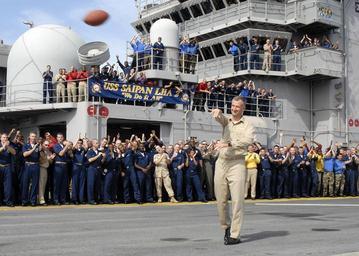 | Keywords: US Navy 061101-N-0938S-089 Capt. Richard D. Fitzpatrick, commanding officer of amphibious assault ship USS Saipan (LHA 2), leads his crew in a moment of revelry during a video shoot for a promotional spot for the upcoming Army.jpg en Arabian Gulf Nov 1 2006 - Capt Richard D Fitzpatrick commanding officer of amphibious assault ship USS Saipan LHA 2 leads his crew in a moment of revelry during a video shoot for a promotional spot for the upcoming Army/Navy college football game Dec 2 2006 Saipan is currently on deployment in the 5th Fleet area of responsibility AOR conducting maritime security operations MSO in the Gulf of Aden Gulf of Oman Arabian Sea Red Sea and Indian Ocean U S Navy photo by Mass Communication Specialist 3rd Class Erik Siegel RELEASED 2006-11-01 061101-N-0938S-089 Navy http //www navy mil/view_image asp id 40477 U S Navy photo by Mass Communication Specialist 3rd Class Erik Siegel PD-USGov-Military-Navy Aboard USS Saipan LHA-2 |