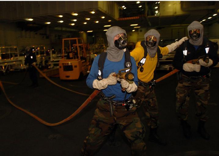 | Keywords: US Navy 061104-N-9723W-019 Hose team members move in to fight a simulated hangar bay fire during a general quarters drill.jpg en Pacific Ocean Nov 4 2006 - Hose team members move in to fight a simulated hangar bay fire during a general quarters drill on board nuclear-powered aircraft carrier USS John C Stennis CVN 74 Stennis is currently participating in Joint Task Force Exercise JTFEX off the coast of Southern California JTFEX is the third at-sea phase of John C Stennis Strike Group's pre-deployment training cycle U S Navy photo by Airman Alan Willis RELEASED 2006-11-04 061104-N-9723W-019 Navy http //www navy mil/view_image asp id 40623 U S Navy photo PD-USGov-Military-Navy Aboard USS John C Stennis CVN-74 Anti-flash gear |