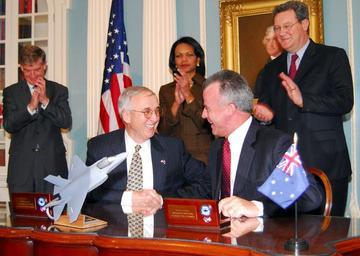 | Keywords: US Navy 061212-N-0962S-037 Deputy Secretary of Defense Gordon R. England and Australian Minister for Defense Brendan Nelson shake hands after signing the Joint Strike Fighter (JSF) Memorandum of Understanding.jpg en Washington D C Dec 12 2006 - Deputy Secretary of Defense Gordon R England and Australian Minister for Defense Brendan Nelson shake hands after signing the Joint Strike Fighter JSF Memorandum of Understanding as Secretary of State Condoleezza Rice and Australian Minister for Foreign Affairs Alexander Downer applaud The signing marks Australia s commitment to participating in the JSF program and continuing the strong relationship with the United States in their partnership in the global war on terrorism The JSF is the military's next generation multi-role strike aircraft designed to complement the Navy F/A-18 and the Air Force F-22 aircraft Australia joins the U S United Kingdom Canada and The Netherlands in signing Memorandums of Understanding The other JSF partner nations Italy Denmark Turkey and Norway are working toward final agreements to development of this highly capable and versatile strike aircraft U S Navy photo by Mass Communication Specialist 1st Class Brandan W Schulze RELEASED 2006-12-12 061212-N-0962S-037 Navy http //www navy mil/view_image asp id 41543 U S Navy photo by Mass Communication Specialist 1st Class Brandan W Schulze PD-USGov-Military-Navy Gordon R England Brendan Nelson Condoleezza Rice in 2006 Alexander Downer |