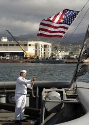 | Keywords: US Navy 070112-N-4400J-062 A Sailor assigned to Military Sealift Command (MSC) raises the ensign for the first time aboard newly recommissioned USNS Salvor.jpg en Pearl Harbor Hawaii Jan 12 2007 - A Sailor assigned to Military Sealift Command MSC raises the ensign for the first time aboard newly recommissioned USNS Salvor The former USS Salvor ARS 52 was transferred from the U S Navy to MSC Salvor was designed for salvage of stranded vessels rescue and assistance recovery of submerged objects and manned diving operations Most recently USS Salvor returned from a scheduled five-month deployment to Southeast Asia in support of Cooperation Afloat Readiness and Training CARAT Exercise 2006 U S Navy photo by Mass Communication Specialist 1st Class Keith Jones RELEASED 2007-01-12 070112-N-4400J-062 Navy http //www navy mil/view_image asp id 42116 U S Navy photo by Mass Communication Specialist 1st Class Keith Jones PD-USGov-Military-Navy USNS Salvor T-ARS-52 at Pearl Harbor Aboard USNS Salvor T-ARS-52 Cooperation Afloat Readiness and Training 2006 Military people with a flag of the United States Flag hoisting |