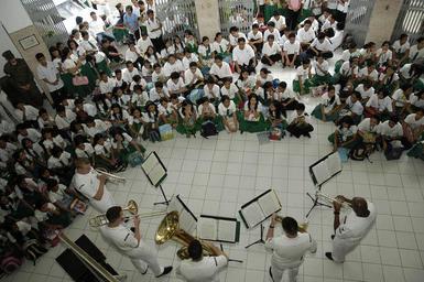 | Keywords: US Navy 070209-N-2746V-003 Students of Manila High School gather in a corridor of the school to watch the U.S. 7th Fleet Band's Shonan Brass, during a community relations (COMREL) event.jpg en Manila Philippines Feb 9 2007 - Students of Manila High School gather in a corridor of the school to watch the U S 7th Fleet Band's Shonan Brass during a community relations COMREL event USS Blue Ridge LCC 19 and embarked U S 7th Fleet staff are in the Philippines as part of Project Friendship a humanitarian assistance/community service project with the Armed Forces of the Philippines Throughout their stay the ship s approximately 1 000 crew and staff along with embarked Marines and Seabees will participate in friendship-building and goodwill-generating activities U S Navy photo by Mass Communication Specialist 2nd Class Adam Vernon RELEASED 2007-02-09 070209-N-2746V-003 Navy http //www navy mil/view_image asp id 43034 U S Navy photo by Mass Communication Specialist 2nd Class Adam Vernon PD-USGov-Military-Navy Images from US Navy location Manila Republic of the Philippines Aboard USS Blue Ridge LCC-19 |