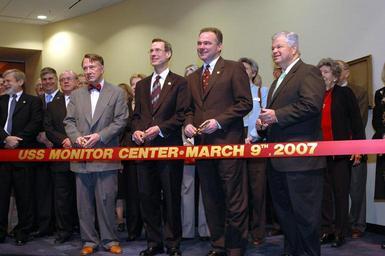 | Keywords: US Navy 070309-N-2456S-097 From left, John B. Hightower, former president and CEO of the Mariners' Museum, retired Navy Vice Adm. Conrad C. Lautenbacher Jr.jpg en NEWPORT NEWS Va March 9 2007 - From left John B Hightower former president and CEO of the Mariners' Museum; retired Navy Vice Adm Conrad C Lautenbacher Jr Undersecretary of Commerce for Oceans and Atmospheric and the National Oceanic and Atmospheric Administration NOAA Administrator; Virginia Gov Timothy Kaine and Newport News Mayor Joe Frank prepare to cut the ribbon opening the USS Monitor Center exhibit The Monitor faced off against the Confederate Ironclad CSS Virginia during the Civil War Battle of Hampton Roads March 9 1862 This battle was the first naval battle between ironclad ships U S Navy photo by Mass Communication Specialist Seaman John Suits RELEASED 2007-03-09 070309-N-2456S-097 Navy http //www navy mil/view_image asp id 43932 U S Navy photo by Mass Communication Specialist Seaman John Suits PD-USGov-Military-Navy Images from US Navy location Newport News Virginia Tim Kaine Joe Frank politician USS Monitor ship 1862 United States military ribbon-cutting ceremonies in the United States |