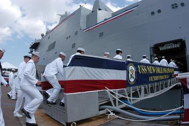 | Keywords: US Navy 070310-N-3429E-003 Sailors assigned to amphibious transport dock ship USS New Orleans (LPD 18) man the ship and bring her to life during the ship's commissioning ceremony Saturday, March 10, 2007.jpg en NEW ORLEANS March 10 2007 Sailors assigned to amphibious transport dock ship USS New Orleans LPD 18 man the ship and bring her to life during the ship's commissioning ceremony Saturday March 10 2007 New Orleans is the second of the San Antonio class ship and the fourth ship to bear the name New Orleans New Orleans is the second ship in the Navy s new San Antonio class As a critical element in future expeditionary strike groups the ship will support the Marine Corps mobility triad which consists of the LCAC landing craft air cushion the expeditionary fighting vehicle and the Osprey tilt-rotor aircraft MV-22 The ship also provides improved warfighting capabilities including an advanced command-and-control suite increased lift-capacity in vehicle and cargo-carrying capability and advanced ship-survivability features The ship holds the distinction of being the only ship in recent naval history built and commissioned in its namesake city USS New Orleans will be homeported in San Diego Calif U S Navy photo by Mass Communication Specialist 2nd Class Kurt Eischen RELEASED 2007-03-10 070310-N-3429E-003 Navy http //www navy mil/view_image asp id 43804 U S Navy photo by Mass Communication Specialist 2nd Class Kurt Eischen PD-USGov-Military-Navy Commissioning of USS New Orleans LPD-18 |