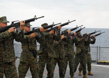 | Keywords: US Navy 070312-N-4124C-005 Marines of the 1st Marine Aircraft Wing Unit (MAU), based out of Okinawa, Japan, conduct a practice fire of a 21-gun salute on the flight deck of dock landing ship USS Harpers Ferry (LSD 49).jpg en PACIFIC OCEAN March 12 2007 - Marines of the 1st Marine Aircraft Wing Unit MAU based out of Okinawa Japan conduct a practice fire of a 21-gun salute on the flight deck of dock landing ship USS Harpers Ferry LSD 49 1st MAU will fire a 21-gun salute during the 62nd Commemoration of the Battle of Iwo Jima March 14 The embarked Marines and Sailors of the Sasebo-based ship will have a chance to observe the remembrance and learn more about the fallen service members of that historic World War II battle U S Navy photo by Mass Communication Specialist 2nd Class Adam R Cole RELEASED 2007-03-12 070312-N-4124C-005 Navy http //www navy mil/view_image asp id 43922 U S Navy photo by Mass Communication Specialist 2nd Class Adam R Cole PD-USGov-Military-Navy Aboard USS Harpers Ferry LSD-49 Males with M16 rifle 21 gun salute Ceremonies of the United States Marine Corps |