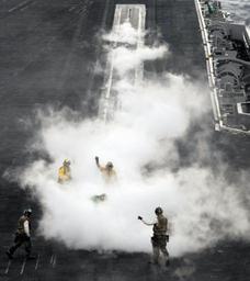 | Keywords: US Navy 070315-N-3659B-041 Standing in the steam of catapult one, an aircraft handler raises his hand to signal that he has control of an aircraft aboard USS Ronald Reagan (CVN 76).jpg en PACIFIC OCEAN March 15 2007 - Standing in the steam of catapult one an aircraft handler raises his hand to signal that he has control of an aircraft aboard USS Ronald Reagan CVN 76 Aircraft handlers are responsible for directing the movement of aircraft on the flight deck and the hangar bay and are vital to the safe and efficient operations in both areas Ronald Reagan Carrier Strike Group and embarked Carrier Air Wing Fourteen CVW 14 are underway in support of operations in the western Pacific U S Navy photo by Mass Communication Specialist 2nd Class Joseph M Buliavac RELEASED 2007-03-15 070315-N-3659B-041 Navy http //www navy mil/view_image asp id 44011 U S Navy photo by Mass Communication Specialist 2nd Class Joseph M Buliavac PD-USGov-Military-Navy Catapults of USS Ronald Reagan CVN-76 |