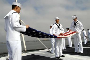 | Keywords: US Navy 070402-N-1205S-192 Aviation Support Equipment Technician 3rd Class Danny Ly, Storekeeper Seaman Joe Jackson and Electronics Technician Timothy Swartz fold the American flag on the flight deck aboard nuclear-powered airc.jpg en SAN DIEGO April 2 2007 - Aviation Support Equipment Technician 3rd Class Danny Ly Storekeeper Seaman Joe Jackson and Electronics Technician Timothy Swartz fold the American flag on the flight deck aboard nuclear-powered aircraft carrier USS Nimitz CVN 68 Nimitz Carrier Strike Group CSG embarked Carrier Air Wing CVW 11 and Destroyer Squadron Group DESRON 23 are deploying to support operations in U S Central Command area of responsibility U S Navy photo by Mass Communication Specialist 2nd Class Jeremiah Sholtis RELEASED 2007-04-02 070402-N-1205S-192 Navy http //www navy mil/view_image asp id 44651 U S Navy photo by Mass Communication Specialist 2nd Class Jeremiah Sholtis PD-USGov-Military-Navy Aviation Support Equipment Technician Naval ship departures from Naval Air Station North Island Aboard USS Nimitz CVN-68 Folding of flags of the United States |