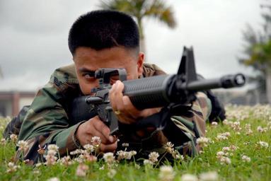 | Keywords: US Navy 070404-N-0775Y-021 Ship Serviceman 1st Class Ronald Umali, attached to Naval Mobile Construction Battalion (NMCB) 3 takes aim with an M-16 rifle during a weapons training course at Camp Shields.jpg en OKINAWA Japan April 4 2007 - Ship Serviceman 1st Class Ronald Umali attached to Naval Mobile Construction Battalion NMCB 3 takes aim with an M-16 rifle during a weapons training course at Camp Shields Seabees from NMCB-3 are taking part in a weeklong military field training exercise as part of a six-month deployment in support of construction operations and the global war on terrorism U S Navy photo by Mass Communication Specialist 1st Class Carmichael Yepez RELEASED 2007-04-04 070404-N-0775Y-021 Navy http //www navy mil/view_image asp id 44985 U S Navy photo by Mass Communication Specialist 1st Class Carmichael Yepez PD-USGov-Military-Navy Males with M16 rifle Camp Shields |