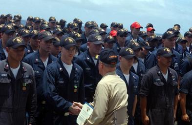 | Keywords: US Navy 070424-N-5148B-065 Commander, Carrier Strike Group (CCSG) 11, Rear Adm. Terry Blake, presents the Navy and Marine Corps Achievement Medal to Engineman 3rd Class Robert Litterer.jpg en PACIFIC OCEAN April 24 2007 - Commander Carrier Strike Group CCSG 11 Rear Adm Terry Blake presents the Navy and Marine Corps Achievement Medal to Engineman 3rd Class Robert Litterer during an Admiral s Call on the flight deck aboard guided missile cruiser USS Princeton CG 59 Princeton is deployed with the Nimitz Carrier Strike Group CSG in support of operations in the U S Central Command area of responsibility U S Navy photo by Mass Communication Specialist Seaman Sarah E Bitter RELEASED 2007-04-24 070424-N-5148B-065 Navy http //www navy mil/view_image asp id 45471 U S Navy photo by Mass Communication Specialist Seaman Sarah E Bitter PD-USGov-Military-Navy Aboard USS Princeton CG-59 John Terence Blake |