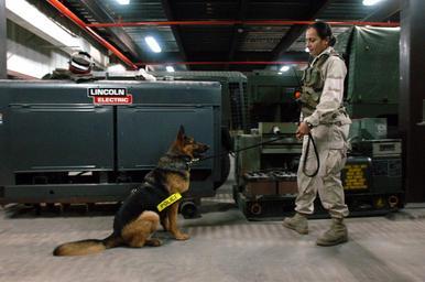 | Keywords: US Navy 070507-N-9818V-071 Master-at-Arms 3rd Class Lisette Latorre, attached to Naval Security Force, K-9 Unit, trains with her military working dog Anna, a four-year-old German shepard.jpg en BAHRAIN May 7 2007 - Master-at-Arms 3rd Class Lisette Latorre attached to Naval Security Force K-9 Unit trains with her military working dog Anna a four-year-old German shepard in a detection proficient trail and training exercise which Anna successfully met her objective of finding the explosive The training is held at least three times per month so the dogs stay adept in detecting explosive odors U S Navy photo by Mass Communication Specialist 2nd Class Jennifer A Villalovos RELEASED 2007-05-07 070507-N-9818V-071 Navy http //www navy mil/view_image asp id 45927 U S Navy photo by Mass Communication Specialist 2nd Class Jennifer A Villalovos PD-USGov-Military-Navy German Shepherd Dog Master-at-arms Military working dogs of the United States United States Navy images from Bahrain |