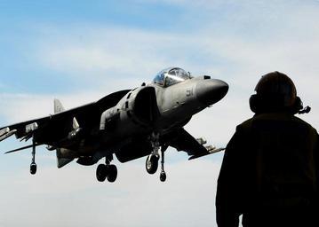 | Keywords: US Navy 070514-N-1831S-111 A Sailor assigned to Air Department aboard the amphibious assault ship USS Kearsarge (LHD 3) guides an AV-8B Harrier II from Marine Medium Helicopter Squadron (HMM) 26), reinforced, onto the flight de.jpg en ATLANTIC OCEAN May 14 2007 - A Sailor assigned to Air Department aboard the amphibious assault ship USS Kearsarge LHD 3 guides an AV/8B Harrier II from Marine Medium Helicopter Squadron HMM 261 reinforced onto the flight deck Kearsarge and embarked 22nd Marine Expeditionary Unit are underway conducting their Composite Training Unit Exercise U S Navy photo by Mass Communication Specialist Seaman Ash Severe RELEASED 2007-05-14 070514-N-1831S-111 Navy http //www navy mil/view_image asp id 46100 U S Navy photo by Mass Communication Specialist Seaman Ash Severe PD-USGov-Military-Navy Aboard USS Kearsarge LHD-3 AV-8B Harrier II US Marine Corps in flight |