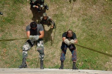 | Keywords: US Navy 070517-N-8391L-015 Two Armed Forces of the Philippines (AFP) soldiers descend a repel tower during a joint U.S.-AFP-Philippine National Police (PNP) Subject Matter Expert Exchange (SMEE).jpg en ZAMBOANGA Republic of the Philippines May 17 2007 - Two Armed Forces of the Philippines AFP soldiers descend a repel tower during a joint U S -AFP-Philippine National Police PNP Subject Matter Expert Exchange SMEE AFP PNP and U S personnel regularly conduct SMEEs to ensure they can work together in crisis and non-crisis circumstances while maintaining the U S -Philippines security partnership U S Navy photo by Mass Communication Specialist 1st Class Troy Latham RELEASED 2007-05-17 070517-N-8391L-015 Navy http //www navy mil/view_image asp id 46567 U S Navy photo by Mass Communication Specialist 1st Class Troy Latham PD-USGov-Military-Navy Images from US Navy location Zamboanga Republic of Philippines Military abseiling Police officers of the Philippines |