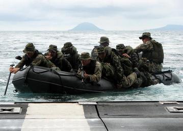 | Keywords: US Navy 070605-N-7058E-005 U.S. and Philippine Marines guide their assault boat to sea after departing from the stern ramp of dock landing ship USS Harpers Ferry (LSD 49) during an amphibious assault exercise near Pilas Island.jpg en SOUTH CHINA SEA June 5 2007 - U S and Philippine Marines guide their assault boat to sea after departing from the stern ramp of dock landing ship USS Harpers Ferry LSD 49 during an amphibious assault exercise near Pilas Island Philippines The Philippine Marine Corps is training with the 3rd Marine Expeditionary Force's Special Operations Training Group SOTG during the 1st phase of the 13th annual Cooperation Afloat Readiness and Training CARAT exercise series CARAT is an annual series of bilateral maritime training exercises between the U S and six Southeast Asia nations designed to build relationships and enhance the operational readiness of the participating forces U S Navy photo by Lt Ed Early RELEASED 2007-06-05 070605-N-7058E-005 Navy http //www navy mil/view_image asp id 46886 U S Navy photo by Lt Ed Early PD-USGov-Military-Navy Aboard USS Harpers Ferry LSD-49 |