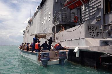 | Keywords: US Navy 070611-N-0989H-024 U.S. service members from the Expeditionary Training Command and Coast Guard International Training Division conduct a vessel assessment aboard a Belizean Coast Guard boat.jpg en BELIZE CITY Belize June 11 2007 - U S service members from the Expeditionary Training Command and Coast Guard International Training Division conduct a vessel assessment aboard a Belizean Coast Guard boat prior to commencing coxswain subject matter exchanges on board High Speed Vessel HSV 2 Swift Task Group 40 9 TG 40 9 is deployed as part of the pilot Global Fleet Station GFS to the Caribbean basin and Central America The mission is designed to validate the GFS concept for the Navy and support U S Southern Command objectives for its area of responsibility by enhancing cooperative partnerships with regional maritime services and improving operational readiness for the participating partner nations U S photo by Mass Communication Specialist 1st Class David Hoffman RELEASED 2007-06-11 070611-N-0989H-024 Navy http //www navy mil/view_image asp id 49029 U S Navy photo PD-USGov-Military-Navy United States Navy in Belize City Exterior of HSV-2 Swift |