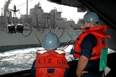 | Keywords: US Navy 070616-N-9760Z-007 Seaman Erik Pardo signals to slow the cargo down while conducting a replenishment at sea with Military Sealift Command fast combat support ship USNS Rainier (T-AOE 7) aboard nuclear-powered aircraft c.jpg en PERSIAN GULF June 16 2007 Seaman Erik Pardo signals to slow the cargo down while conducting a replenishment at sea with Military Sealift Command fast combat support ship USNS Rainier T-AOE 7 aboard nuclear-powered aircraft carrier USS Nimitz CVN 68 Nimitz Carrier Strike Group and embarked Carrier Air Wing 11 are deployed in the U S 5th Fleet conducting maritime operations and supporting the global war on terrorism U S Navy photo by Mass Communication Specialist 3rd Class Eduardo Zaragoza RELEASED 2007-06-16 070616-N-9760Z-007 Navy http //www navy mil/view_image asp id 47234 U S Navy photo by Mass Communication Specialist 3rd Class Eduardo Zaragoza PD-USGov-Military-Navy Cargo in transfer underway replenishment Aboard USS Nimitz CVN-68 |