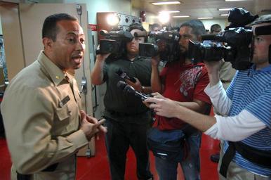| Keywords: US Navy 070617-N-0194K-293 Casualty and Receiving Division Officer Lt. Cmdr. Manny Santiago addresses Miami media aboard Military Sealift Command hospital ship USNS Comfort (T-AH 20).jpg en ATLANTIC OCEAN June 17 2007 - Casualty and Receiving Division Officer Lt Cmdr Manny Santiago addresses Miami media aboard Military Sealift Command hospital ship USNS Comfort T-AH 20 Comfort is scheduled to visit Latin America and the Caribbean where Sailors will provide medical treatment to approximately 85 000 patients in a dozen countries U S Navy photo by Mass Communication Specialist 2nd Class Steven King RELEASED 2007-06-17 070617-N-0194K-293 Navy http //www navy mil/view_image asp id 47323 U S Navy photo by Mass Communication Specialist 2nd Class Steven King PD-USGov-Military-Navy Aboard USNS Comfort T-AH-20 |