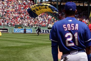 | Keywords: US Navy 070701-N-8110K-010 Major League Baseball^rsquo,s Sammy Sosa watches as a member of the Navy Parachute Team Leap Frogs lands in Boston^rsquo,s Fenway Park prior to a Red Sox Game.jpg en BOSTON July 1 2007 - Major League Baseball s Sammy Sosa watches as a member of the Navy Parachute Team Leap Frogs lands in Boston s Fenway Park prior to a Red Sox Game The parachute team s first ever performance in Fenway was just one of many events planned during Boston Navy Week The week is one of 26 Navy Weeks planned across America in 2007 Navy Weeks are designed to show Americans the investment they have made in their Navy and increase awareness in cities that do not have a significant Navy presence U S Navy photo by Chief Mass Communication Specialist Dave Kaylor RELEASED 2007-07-01 070701-N-8110K-010 Navy http //www navy mil/view_image asp id 48108 U S Navy photo by Chief Mass Communication Specialist Dave Kaylor PD-USGov-Military-Navy Images from US Navy location BOSTON Sammy Sosa 2007 Boston Red Sox season United States Navy Parachute Team Boston Navy Week Major League Baseball's Sammy Sosa watches as a member of the Navy Parachute Team Leap Frogs lands in Boston's Fenway Park prior to a Red Sox Game.jpg Sammy Sosa watches as a member of the Navy Parachute Team Leap Frogs lands in Boston s Fenway Park prior to a Red Sox Game The parachute team s first ever performance in Fenway was just one of many events planned during Boston Navy Week The week is one of 26 Navy Weeks planned across America in 2007 Navy Weeks are designed to show Americans the investment they have made in their Navy and increase awareness in cities that do not have a significant Navy presence U S Navy photo by Chief Mass Communication Specialist Dave Kaylor RELEASED 2007-07-01 070701-N-8110K-010 Navy http //www navy mil/view_image asp id 48108 U S Navy photo by Chief Mass Communication Specialist Dave Kaylor PD-USGov-Military-Navy Images from US Navy location BOSTON Sammy Sosa 2007 Texas Rangers season United States Navy Parachute Team Boston Navy Week 2007 Boston Red Sox season |