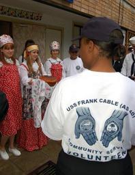 | Keywords: US Navy 070702-N-5525H-002 Sailors attached to submarine tender USS Frank Cable (AS 40) receive the traditional Russian Bread and Salt Ceremony upon their arrival at a regional children's rehabilitation center.jpg en VLADIVOSTOK Russia July 2 2007 - Sailors attached to submarine tender USS Frank Cable AS 40 receive the traditional Russian Bread and Salt Ceremony upon their arrival at a regional children's rehabilitation center The Sailors took time to meet the children and participate in games designed to aid in the children's rehabilitation process Frank Cable Sailors routinely participate in various community relations projects while in foreign ports and in Frank Cable's forward deployed homeport of Guam U S Navy photo by Mass Communication Specialist 2nd Class Zachary Harris RELEASED 2007-07-02 070702-N-5525H-002 Navy http //www navy mil/view_image asp id 47899 U S Navy photo by Mass Communication Specialist 2nd Class Zachary Harris PD-USGov-Military-Navy Images from US Navy location Vladivostok Russian Federation Bread and salt in Russia Aboard USS Frank Cable AS-40 |