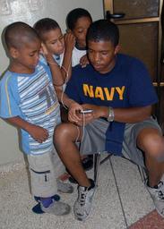 | Keywords: US Navy 070704-N-9486C-001 Master-at-Arms 1st Class Jermaine Bing shares his music with children at the La Casa Rosada home for Dominican children with HIV.jpg en SANTO DOMINGO Dominican Republic July 4 2007 - Master-at-Arms 1st Class Jermaine Bing shares his music with children at the La Casa Rosada home for Dominican children with HIV Bing is attached to Task Group 40 9 which is deployed as part of the pilot Global Fleet Station GFS to the Caribbean basin and Central America The mission is designed to validate the GFS concept for the Navy and support U S Southern Command objectives for its area of responsibility U S Navy photo by Mass Communication Specialist 1st Class Cynthia Clark RELEASED 2007-07-04 070704-N-9486C-001 Navy http //www navy mil/view_image asp id 48262 U S Navy photo by Mass Communication Specialist 1st Class Cynthia Clark PD-USGov-Military-Navy Images from US Navy location Santo Domingo Dominican Republic Master-at-arms |