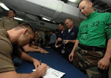 | Keywords: US Navy 070713-N-8923M-164 Ultimate Fighting Championship (UFC) fighter Rich Franklin signs his name for a Sailor during an autograph session on the mess decks aboard Nimitz-class aircraft carrier USS Harry S. Truman (CVN 75).jpg en ATLANTIC OCEAN July 13 2007 - Ultimate Fighting Championship UFC fighter Rich Franklin signs his name for a Sailor during an autograph session on the mess decks aboard Nimitz-class aircraft carrier USS Harry S Truman CVN 75 Dr Michael Gervais President of Pinnacle Performance Center Inc ; UFC fighters Rich Franklin and Mike Pyle; and UFC referee Big John McCarthy visited the Truman for two days to help increase morale for the Sailors Truman is underway in the Atlantic Ocean participating in the Composite Training Unit Exercise COMTUEX in preparation for deployment to the Persian Gulf U S Navy photo by Seaman Kevin T Murray Jr RELEASED 2007-07-13 070713-N-8923M-164 Navy http //www navy mil/view_image asp id 48295 U S Navy photo by Seaman Kevin T Murray Jr PD-USGov-Military-Navy Aboard USS Harry S Truman CVN-75 Rich Franklin |