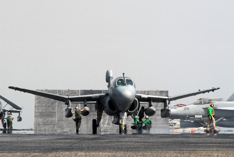 | Keywords: US Navy 070720-N-8119R-083 An EA-6B Prowler, assigned to the Black Ravens of Tactical Electronic Warfare Squadron (VAQ) 135, lowers its wings while Sailors do last minute safety checks before launch aboard nuclear-powered aircr.jpg en PERSIAN GULF July 20 2007 - An EA-6B Prowler assigned to the Black Ravens of Tactical Electronic Warfare Squadron VAQ 135 lowers its wings while Sailors do last minute safety checks before launch aboard nuclear-powered aircraft carrier USS Nimitz CVN 68 Nimitz Strike Group and embarked Carrier Air Wing CVW 11 are deployed in the 5th Fleet area of operations conducting maritime operations and supporting the global war on terrorism U S Navy photo by Mass Communication Specialist 3rd Class Gretchen M Roth RELEASED 2007-07-20 070720-N-8119R-083 Navy http //www navy mil/view_image asp id 48588 U S Navy photo by Mass Communication Specialist 3rd Class Gretchen M Roth PD-USGov-Military-Navy Grumman EA-6 Prowler aircraft carrier launches Aboard USS Nimitz CVN-68 |