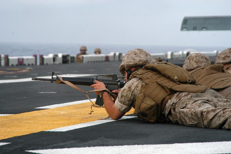 Keywords: US Navy 070806-N-7955L-039 A U.S. Marine attached to Marine Expeditionary Unit (MEU) 22 participates in a live-fire exercise on the flight deck of the amphibious assault ship USS Kearsarge (LHD 3).jpg en ATLANTIC OCEAN Aug 6 2007 - A U S Marine attached to Marine Expeditionary Unit MEU 22 participates in a live-fire exercise on the flight deck of the amphibious assault ship USS Kearsarge LHD 3 Kearsarge is on a six-month scheduled deployment in support of Maritime Operations MO U S Navy photo by Mass Communication Specialist Seaman Christopher Lange RELEASED 2007-08-06 070806-N-7955L-039 Navy http //www navy mil/view_image asp id 49187 U S Navy photo by Mass Communication Specialist Seaman Christopher Lange PD-USGov-Military-Navy Aboard USS Kearsarge LHD-3 Males with M16 rifle |