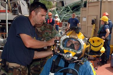 | Keywords: US Navy 070808-N-3093M-020 Chief Navy Diver Scott Maynard of Mobile Diving and Salvage Unit (MDSU) 2 makes final checks on Navy Diver 2nd Class Noah Gotteman's MK-21 diving helmet.jpg en MINNEAPOLIS Minn Aug 8 2007 - Chief Navy Diver Scott Maynard of Mobile Diving and Salvage Unit MDSU 2 makes final checks on Navy Diver 2nd Class Noah Gotteman's MK-21 diving helmet before a dive into the Mississippi River MDSU-2 is assisting other federal state and local authorities managing disaster and recovery efforts at the site U S Navy photo by Senior Chief Mass Communication Specialist Andrew McKaskle RELEASED 2007-08-08 070808-N-3093M-020 Navy http //www navy mil/view_image asp id 49274 U S Navy photo by Senior Chief Mass Communication Specialist Andrew McKaskle PD-USGov-Military-Navy I-35W Mississippi River Bridge collapse recovery MK-21 diving helmet United States Navy Divers |