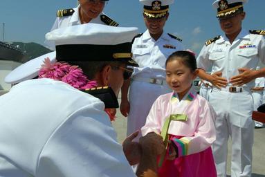 | Keywords: US Navy 070818-N-5334H-001 Capt. David A. Lausman, commanding officer of USS Blue Ridge (LCC 19), gives a young Korean girl an honorary ship^rsquo,s coin after receiving a gift of a flower necklace.jpg en CHINHAE Korea Aug 16 2007 - Capt David A Lausman commanding officer of USS Blue Ridge LCC 19 gives a young Korean girl an honorary ship s coin after receiving a gift of a flower necklace The ship is on a short-term deployment in Southeast Asia to support the combined joint computer simulation driven Ulchi Focus Lens exercise involving forces from the United States and Republic of Korea Blue Ridge is the 7th Fleet flagship and is permanently forward deployed to Yokosuka Japan U S Navy photo by Mass Communication Specialist 2nd Class David Hewitt RELEASED 2007-08-16 070818-N-5334H-001 Navy http //www navy mil/view_image asp id 49722 U S Navy photo by Mass Communication Specialist 2nd Class David Hewitt PD-USGov-Military-Navy David Lausman Images from US Navy location Jinhae South Korea |