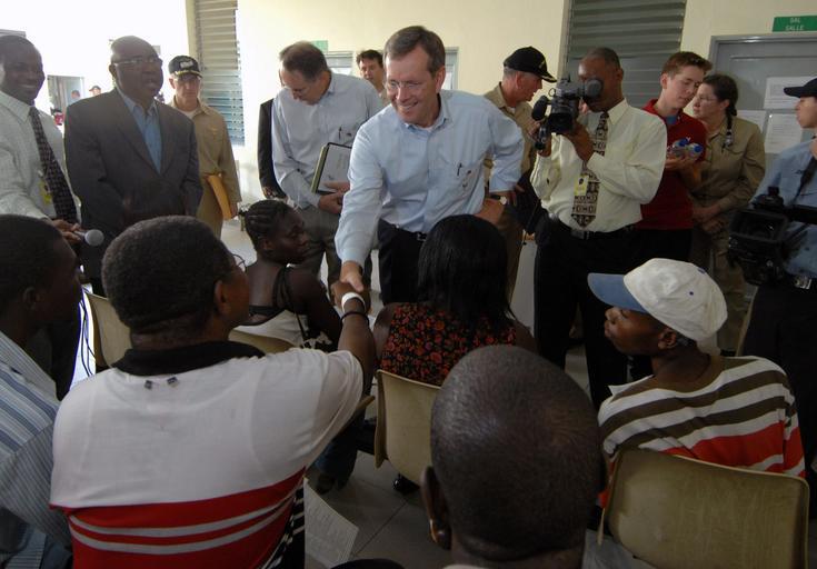 | Keywords: US Navy 070907-N-0194K-202 Secretary of Health and Human Services, Michael Leavitt speaks with Haitian patients awaiting medical care during his tour of the Military Sealift Command hospital ship USNS Comfort (T-AH 20) medical.jpg en PORT-AU-PRINCE Haiti Sept 7 2007 - Secretary of Health and Human Services Michael Leavitt speaks with Haitian patients awaiting medical care during his tour of the Military Sealift Command hospital ship USNS Comfort T-AH 20 medical site at Hôpital Universitaire de la Paix Comfort is on a four-month humanitarian deployment to Latin America and the Caribbean providing medical treatment in a dozen countries U S Navy photo by Mass Communication Specialist 2nd Class Steven King RELEASED 2007-09-07 070907-N-0194K-202 Navy http //www navy mil/view_image asp id 50655 U S Navy photo by Mass Communication Specialist 2nd Class Steven King PD-USGov-Military-Navy USNS Comfort in Haiti 2007 Hôpital universitaire de la Paix Port-au-Prince Journalism in Haiti 2007 in Port-au-Prince Michael O Leavitt |