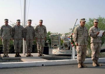 | Keywords: US Navy 070911-N-3285B-138 Members of the color guard stand by as Electronics Technician 1st Class Arcenet Vazquez shares a few words after presenting a wreath in remembrance of the sixth anniversary of the Sept. 11 terrorist a.jpg en CAMP LEMONIER Djibouti Sept 11 2007 - Members of the color guard stand by as Electronics Technician 1st Class Arcenet Vazquez shares a few words after presenting a wreath in remembrance of the sixth anniversary of the Sept 11 terrorist attack The wreath presentation was one of the Sept 11 remembrance events on Camp Lemonier U S Navy photo by Mass Communication Specialist 2nd Class Regina L Brown RELEASED 2007-09-11 070911-N-3285B-138 Navy http //www navy mil/view_image asp id 50762 U S Navy photo by Mass Communication Specialist 2nd Class Regina L Brown PD-USGov-Military-Navy Camp Lemonnier Sixth anniversary of the September 11 2001 attacks |
