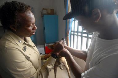 | Keywords: US Navy 070927-N-9562H-019 U.S. Public Health Service Cmdr. Princess Campbell, a veterinarian attached to the Military Sealift Command hospital ship USNS Comfort (T-AH 20), stabilizes a dog with help of owner Damien James.jpg en GEORGETOWN Guyana Sept 27 2007 - U S Public Health Service Cmdr Princess Campbell a veterinarian attached to the Military Sealift Command hospital ship USNS Comfort T-AH 20 stabilizes a dog with help of owner Damien James at the Guyana Society for the Prevention of Cruelty to Animals Comfort is on a four-month humanitarian deployment to Latin America and the Caribbean providing medical treatment to patients in a dozen countries U S Navy photo by Mass Communication Specialist Seaman Jeff Hall RELEASED 2007-09-27 070927-N-9562H-019 Navy http //www navy mil/view_image asp id 51332 U S Navy photo by Mass Communication Specialist Seaman Jeff Hall PD-USGov-Military-Navy Georgetown Guyana Aboard USNS Comfort T-AH-20 |