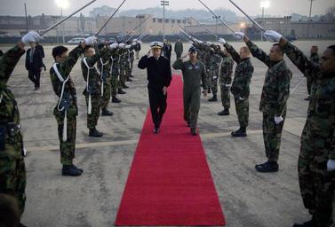 | Keywords: US Navy 071107-N-0696M-357 Brig. Gen. Punch Moulton, vice commander of 7th Air Force, escorts Chairman of the Joint Chiefs of Staff, Adm. Mike Mullen through a Osan Air Base honor guard, prior to departing Osan Air Base.jpg en SEOUL Republic of Korea Nov 7 2007 - Brig Gen Punch Moulton vice commander of 7th Air Force escorts Chairman of the Joint Chiefs of Staff Adm Mike Mullen through a Osan Air Base honor guard prior to departing Osan Air Base and concluding a three-day visit to Korea Mullen participated in talks discussing the progress of transferring wartime operational control of Korean troops to Seoul and held a town hall meeting with troops stationed Yongsan Army Garrison U S Navy photo by Mass Communication Specialist 1st Class Chad J McNeeley RELEASED 2007-11-07 071107-N-0696M-357 Navy http //www navy mil/view_image asp id 52531 U S Navy photo by Mass Communication Specialist 1st Class Chad J McNeeley PD-USGov-Military-Navy Images from US Navy location Osan Republic of South Korea Michael G Mullen in 2007 Osan Air Base |