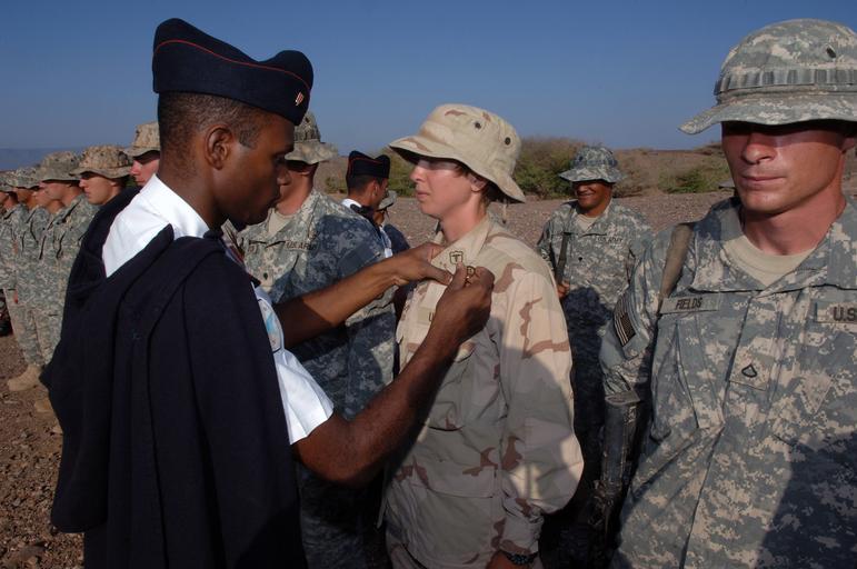 | Keywords: US Navy 071113-N-3931M-030 An instructor from the French military pins a survival badge on U.S. Navy Hospital Corpsman 3rd Class Gwendolyn Collver, assigned to Combined Joint Task Force-Horn of Africa, upon completion of a dese.jpg en SIDA Djibouti Nov 13 2007 An instructor from the French military pins a survival badge on U S Navy Hospital Corpsman 3rd Class Gwendolyn Collver assigned to Combined Joint Task Force-Horn of Africa upon completion of a desert survival course conducted by the French military The training consisted of class instruction on land navigation using global positioning systems cooking and eating to survive how to use camels to transport equipment helicopter medical evacuations how to start a fire and techniques for rigging traps U S Navy photo by Mass Communication Specialist 1st Class Michael R McCormick Released 2007-11-13 071113-N-3931M-030 Navy http //www navy mil/view_image asp id 52892 U S Navy photo by Mass Communication Specialist 1st Class Michael R McCormick PD-USGov-Military-Navy Images from US Navy location SIDA Djibouti Presentation of military decorations |