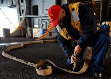 | Keywords: US Navy 071120-N-9898L-025 Damage Controlman 3rd Class Reginald Rose attaches a veri-nozzle to a fire hose in order to conduct a test of a P-100 water pump in the hangar bay aboard the Nimitz-class nuclear-powered aircraft carr.jpg en PACIFIC OCEAN Nov 20 2007 Damage Controlman 3rd Class Reginald Rose attaches a veri-nozzle to a fire hose in order to conduct a test of a P-100 water pump in the hangar bay aboard the Nimitz-class nuclear-powered aircraft carrier USS Abraham Lincoln CVN 72 Lincoln is underway off the West Coast en-route to its homeport of Everett Wash after successfully completing a composite training unit exercise off the coast of Southern California U S Navy photo by Mass Communication Specialist 3rd Class Geoffrey Lewis Released 2007-11-20 071120-N-9898L-025 Navy http //www navy mil/view_image asp id 52952 U S Navy photo by Mass Communication Specialist 3rd Class Geoffrey Lewis PD-USGov-Military-Navy Damage Controlman Aboard USS Abraham Lincoln CVN-72 |