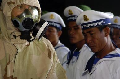 | Keywords: US Navy 071128-N-1242B-058 A U.S. Navy Sailor shows Royal Cambodian navy sailors the proper use of a full chemical-protective garment aboard the amphibious assault ship USS Essex (LHD 2).jpg en SIHANOUKVILLE Kingdom of Cambodia Nov 28 2007 A U S Navy Sailor shows Royal Cambodian navy sailors the proper use of a full chemical/protective garment aboard the amphibious assault ship USS Essex LHD 2 Seventy-five Royal Cambodian navy sailors visited Essex to learn basic damage control and tour the ship Essex and the embarked 31st Marine Expeditionary Unit arrived in Sihanoukville Kingdom of Cambodia Nov 26 for a scheduled port visit that gives Sailors and Marines the opportunity to participate in friendship-building community relations events medical and dental projects and professional exchanges Essex is the lead ship of the only forward-deployed U S Expeditionary Strike Group and serves as the flagship for CTF 76 the Navy's only forward-deployed amphibious force commander Task Force 76 is headquartered at White Beach Naval Facility Okinawa Japan with a detachment in Sasebo Japan U S Navy photo by Mass Communication Specialist 1st Class Jeffrey Ballge Released 2007-11-28 071128-N-1242B-058 Navy http //www navy mil/view_image asp id 53184 U S Navy photo by Mass Communication Specialist 1st Class Jeffrey Ballge PD-USGov-Military-Navy Military of Cambodia Aboard USS Essex LHD-2 Males wearing gas masks MCU-2/P Protective Mask Military protective clothing |