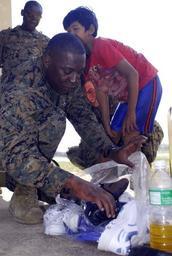 | Keywords: US Navy 071128-N-4010S-286 Maj. Jeramy Green searches through a bag of donated shoes for a young Cambodian boy.jpg en PHNOM PENH Kingdom of Cambodia Nov 28 2007 Maj Jeramy Green assigned to the Command Element of the 31st Marine Expeditionary Unit aboard the amphibious assault ship USS Essex LHD 2 searches through a bag of donated shoes for a young Cambodian boy Essex and the embarked 31st Marine Expeditionary Unit MEU are in Sihanoukville Kingdom of Cambodia for a scheduled port visit that gives Sailors and Marines the opportunity to participate in friendship-building community relations events medical and dental projects and professional exchanges Essex is the lead ship of the only forward-deployed U S Expeditionary Strike Group and serves as the flagship for CTF 76 the Navy's only forward-deployed amphibious force commander Task Force 76 is headquartered at White Beach Naval Facility Okinawa Japan with a detachment in Sasebo Japan U S Navy photo by Chief Mass Communication Specialist Ty Swartz Released 2007-11-28 071128-N-4010S-286 Navy http //www navy mil/view_image asp id 53254 U S Navy photo by Chief Mass Communication Specialist Ty Swartz PD-USGov-Military-Navy United States Navy in Phnom Penh |