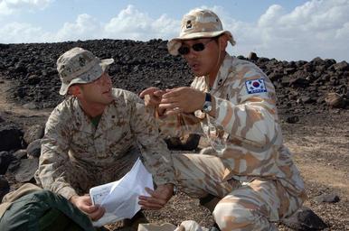| Keywords: US Navy 071204-N-3931M-078 Republic of Korea Army Maj. Youngjin Kim from Combined Joint Task Force Horn of Africa (CJTF-HOA) and U.S. Marine Corps Maj. Guy Ravey, discuss range operations at the Gordia bombing range off the coa.jpg en DJIBOUTI Africa Dec 4 2007 Republic of Korea Army Maj Youngjin Kim from Combined Joint Task Force Horn of Africa CJTF-HOA and U S Marine Corps Maj Guy Ravey discuss range operations at the Gordia bombing range off the coast of Djibouti during a bombing exercise conducted by F/A-18 Hornet aircraft from the Red Rippers of Strike Fighter Squadron VFA 11 embarked aboard USS Harry S Truman CVN-75 CJTF-HOA conducts operations in the region to prevent conflict promote regional stability and protect coalition interests U S Navy photo by Mass Communication Specialist 1st Class Michael R McCormick Released 2007-12-04 071204-N-3931M-078 Navy http //www navy mil/view_image asp id 53654 U S Navy photo by Mass Communication Specialist 1st Class Michael R McCormick PD-USGov-Military-Navy Gordia bombing range Taken with Nikon D2X People of the United States Marine Corps Military of South Korea |