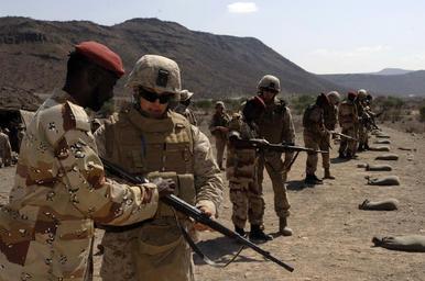 | Keywords: US Navy 071210-F-0509T-006 Hospitalman 3rd Class Jeremy Jordon instructs a member from the Djiboutian Army on the PK-M (Djiboutian firearm) at Arta Range TC-13.jpg en DJIBOUTI Dec 10 2007 Hospitalman 3rd Class Jeremy Jordon instructs a member from the Djiboutian Army on the PK-M Djiboutian firearm at Arta Range TC-13 Jordon is from the Battalion Landing Team 3rd Battalion 8th Marine Regiment Kilo Company 22 Marine Expeditionary Unit from the amphibious dock landing ship USS Gunston Hall LSD 44 During this training U S service members instruct the Djiboutian military on weapons fundamentals U S Air Force photo by Senior Airman Jamie Train Released 2007-12-10 071210-F-0509T-006 Navy http //www navy mil/view_image asp id 53805 U S Navy photo PD-USGov-Military-Navy 3rd Battalion 8th Marines Males with assault rifles Army of Djibouti Type 56 rifle |