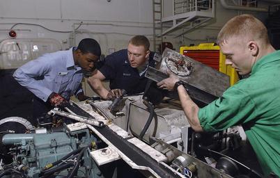 | Keywords: US Navy 080111-N-0455L-004 Aviation Support Equipment Technician Airman Shounie Capers, left, Aviation Support Equipment Technician 3rd Class William Byrum and Aviation Support Equipment Technician 3rd Class James Calderis repl.jpg en PERSIAN GULF January 11 2008 Aviation Support Equipment Technician Airman Shounie Capers left Aviation Support Equipment Technician 3rd Class William Byrum and Aviation Support Equipment Technician 3rd Class James Calderis replace the ring gear of a starter in a tractor used for transporting aircraft throughout the hangar bay of the Nimitz-class nuclear-powered aircraft carrier USS Harry S Truman CVN 75 Truman and embarked Carrier Air Wing CVW 3 are on a scheduled deployment in support of maritime security operations U S Navy photo by Mass Communication Specialist Seaman Justin Lee Losack Released 2008-01-11 080111-N-0455L-004 Navy http //www navy mil/view_image asp id 54474 U S Navy photo by Mass Communication Specialist Seaman Justin Lee Losack PD-USGov-Military-Navy Aviation Support Equipment Technician Aboard USS Harry S Truman CVN-75 |