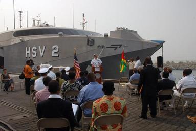 | Keywords: US Navy 080129-N-0193M-081 Cmdr. Charles Rock, commanding officer aboard the high speed vessel (HSV) 2 Swift, explains how Africa Partnership Station (APS) donated 107,000 meals to malnourished children through Project Handclas.jpg en LOME Togo Jan 29 2008 Cmdr Charles Rock commanding officer aboard the high speed vessel HSV 2 Swift explains how Africa Partnership Station APS donated 107 000 meals to malnourished children through Project Handclasp APS volunteers and members of Project Handclasp also donated toys and hygiene supplies to the children During the deployment APS will donate more than 150 pallets of food supplements medical supplies and hygiene products those in need in West and Central Africa U S Navy photo by Mass Communication Specialist 2nd Class Elizabeth Merriam Released 2008-01-29 080129-N-0193M-081 Navy http //www navy mil/view_image asp id 54977 U S Navy photo by Mass Communication Specialist 2nd Class Elizabeth Merriam PD-USGov-Military-Navy United States Navy in Lomé Exterior of HSV-2 Swift Coasts of Togo Africa Partnership Station 2008 Project Handclasp United States Navy |