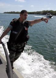 | Keywords: US Navy 080130-N-9758L-085 Master-at-Arms 2nd Class Danny Hebri, assigned to Harbor Security on board Naval Station Pearl Harbor, directs a Seaark Dauntless security boat towards a target while patrolling the Harbor.jpg en PEARL HARBOR Hawaii Jan 30 2008 Master-at-Arms 2nd Class Danny Hebri assigned to Harbor Security on board Naval Station Pearl Harbor directs a Seaark Dauntless security boat towards a target while patrolling the Harbor Harbor Security protects the harbor and its assets from threats on land and sea and act as security escorts for all vessels arriving and departing Pearl Harbor U S Navy photo by Mass Communication Specialist 2nd Class Michael A Lantron Released 2008-01-30 080130-N-9758L-085 Navy http //www navy mil/view_image asp id 54974 U S Navy photo by Mass Communication Specialist 2nd Class Michael A Lantron PD-USGov-Military-Navy 2008 in Pearl Harbor Images from US Navy location Pearl Harbor Hawaii Master-at-arms Patrol boats of the United States Navy Pointing right |