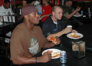 | Keywords: US Navy 080203-N-7310D-005 San Diego Chargers wide receiver Kassim Osgood eats pizza with Sailors on the mess deck aboard the Pearl Harbor-based Ticonderoga-class guided-missile cruiser USS Chosin (CG 65).jpg en PEARL HARBOR Hawaii Feb 3 2008 San Diego Chargers wide receiver Kassim Osgood eats pizza with Sailors on the mess deck aboard the Pearl Harbor-based Ticonderoga-class guided-missile cruiser USS Chosin CG 65 during a visit aboard the ship to watch Super Bowl XLII with the crew U S Navy photo by Mass Communication Specialist 3rd Class David N Dexter Released 2008-02-03 080203-N-7310D-005 Navy http //www navy mil/view_image asp id 55021 U S Navy photo by Mass Communication Specialist 3rd Class David N Dexter PD-USGov-Military-Navy 2008 in Pearl Harbor USS Chosin CG-65 at Pearl Harbor Images from US Navy location Pearl Harbor Hawaii Aboard USS Chosin CG-65 |