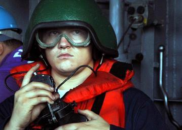 | Keywords: US Navy 080609-N-9604C-083 Boatswain's Mate Seaman Aaron Turner uses sound-powered phones to communicate information regarding fuel consumption.jpg en INDIAN OCEAN June 9 2008 Boatswain's Mate Seaman Aaron Turner uses sound-powered phones to communicate information regarding fuel consumption on the starboard side of the amphibious assault ship USS Peleliu LHA 5 during a replenishment at sea with the Military Sealift Command fleet replenishment oiler USNS Walter S Diehl Peleliu is conducting exercises in the Indian Ocean on a scheduled deployment U S Navy photo by Mass Communication Seaman Shannon K Cassidy Released 2008-06-09 080609-N-9604C-083 Navy http //www navy mil/view_image asp id 60062 U S Navy photo by Mass Communication Seaman Shannon K Cassidy PD-USGov-Military-Navy Phone talkers underway replenishment Aboard USS Peleliu LHA-5 People of the United States Navy with sound-powered telephones |