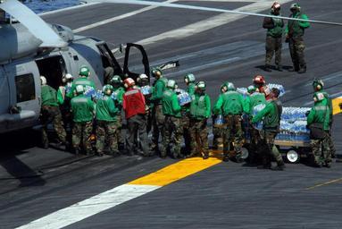 | Keywords: US Navy 080625-N-4005H-054 Sailors load cases of water bound for the Philippines onto an HH-60H helicopter.jpg en PACIFIC OCEAN June 25 2008 Sailors load cases of water bound for the Philippines onto an HH-60H helicopter assigned to the Black Knights of Helicopter Anti-Submarine Squadron HS 4 on the flight deck of the Nimitz-class aircraft carrier USS Ronald Reagan CVN 76 Ronald Reagan sent 12 000 bottles of water and 7 500 pounds of Rice to the Philippines supporting disaster relief efforts The Ronald Reagan Carrier Strike Group is support the government of the Republic of the Philippines to help provide humanitarian assistance and disaster relief to the victims of Typhoon Fengshen U S Navy photo by Mass Communication Specialist 3rd Class Aaron Holt Released 2008-06-25 080625-N-4005H-054 Navy http //www navy mil/view_image asp id 60592 U S Navy photo by Mass Communication Specialist 3rd Class Aaron Holt PD-USGov-Military-Navy USS Ronald Reagan CVN-76 humanitarian aid HH-60H Rescue Hawk Helicopter Anti-Submarine Squadron 4 United States Navy Typhoon Fengshen 2008 Bottled water |